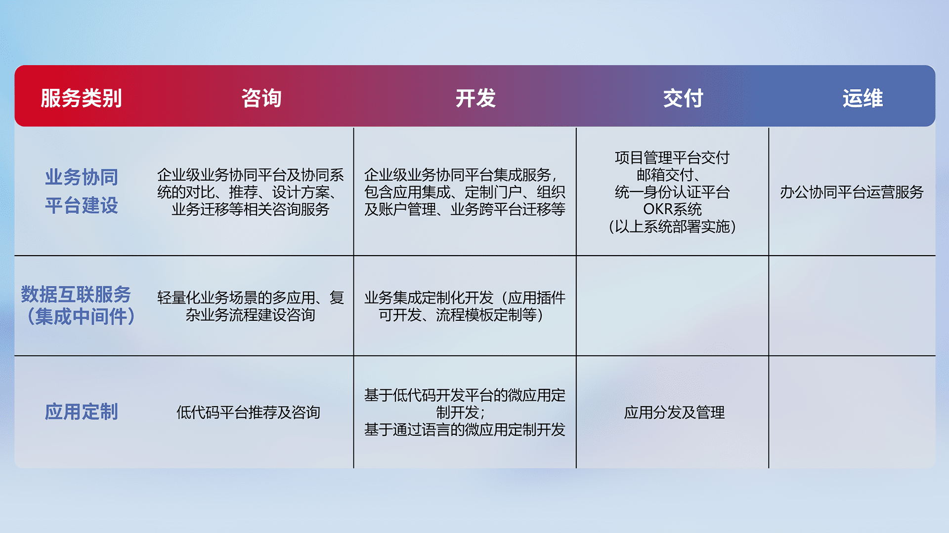 针对钉钉、、、企微、、IDaas等平台级产品提供产品的规划、、方案、、交付、、定制化开发等服务,,实现如统一协同办公、、、智能客户服务、、、混合会议管理、、智能数据查询、、、等业务场景,,,实现数字化转型。。